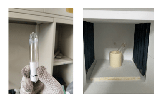 We weighed it using an electronic balance to 3 decimal places and then poured both the weighed A, B into a small aluminum oxide crucible. Select a glass tube, pad it with quartz wool underneath, and place the alumina crucible in it with the opening facing up.