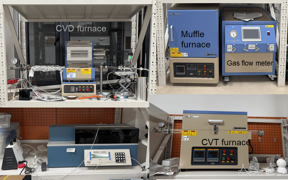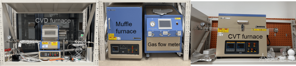 • CVT furnace: Single-crystal growth via iodine transport in a dual-zone furnace
