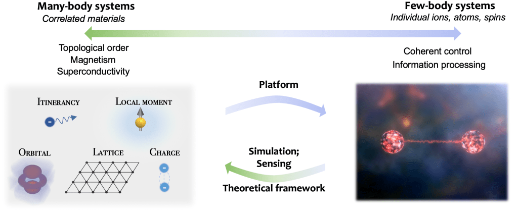 2. Many-body states of matter. A macroscopic number of electrons or spins can act collectively to form states of matter where non-classical effects prevail. Many electrons, for example, can act coherently to form condensates such as superconductivity. Many spins can form unconventional magnetic states such as spin liquids (see Project 2 below) or exhibit macroscopic tunneling and coherence effects. We hope to leverage coherent probes and new material systems to provide a fresh perspective to these important topics.